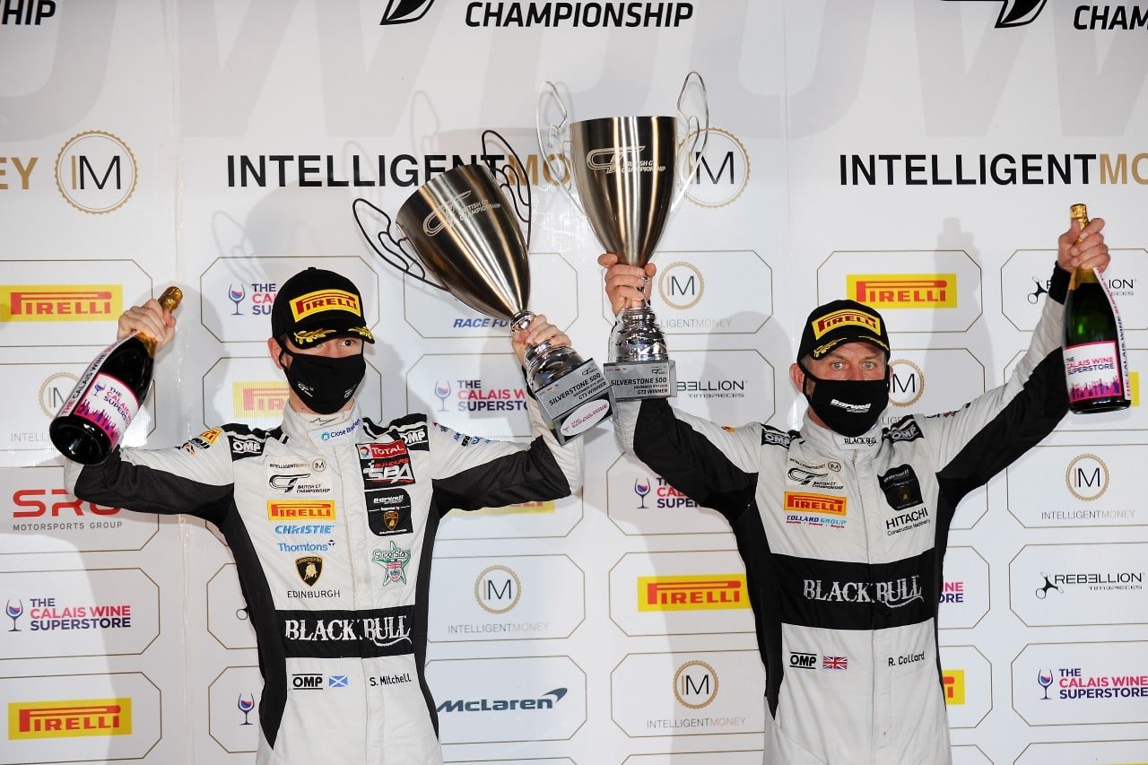 The #78 Barwell Motorsport Lamborghini Huracan GT driven by Rob Collard and Sandy Mitchell took the chequered flag to win the Silverstone 500, the final round of the 2020 Intelligent Money British GT Championship, and secure the 2020 GT3 drivers championship for the Barwell duo..