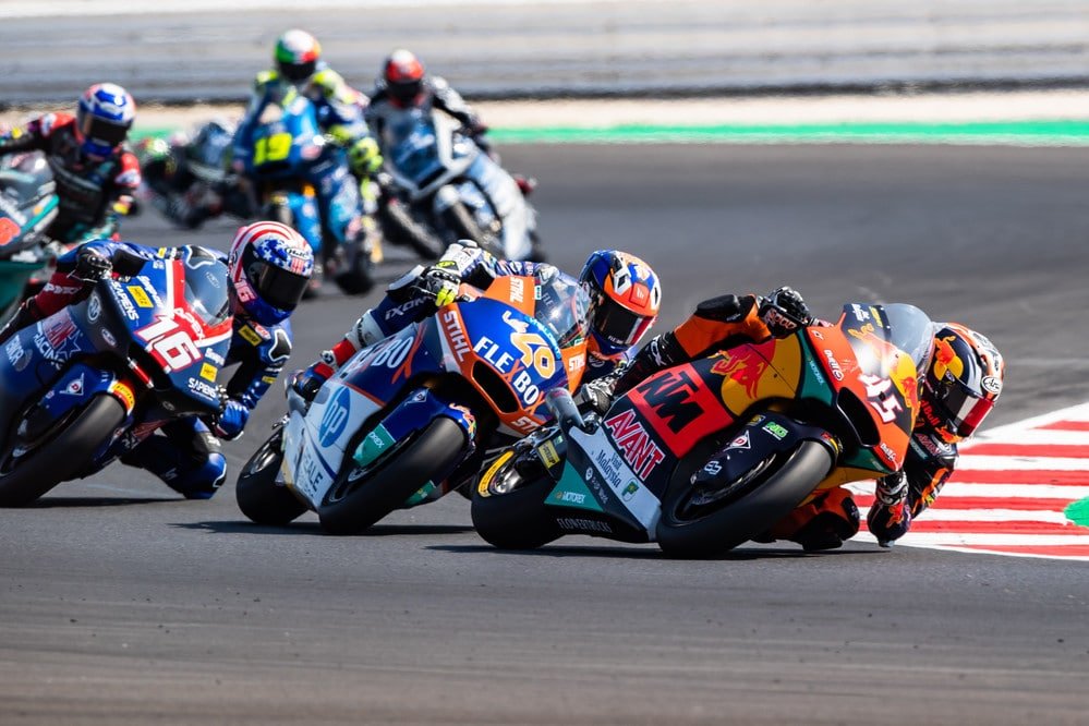 Vierge did not make as good a start as he did in the first start, and instead it was Marini who passed Bastianini into turn one to take the holeshot. Marini’s lead did not last long, however, as Bastianini passed him four turns into the restarted race in much the same way as he did in the first start, forcing both himself and Marini wide.