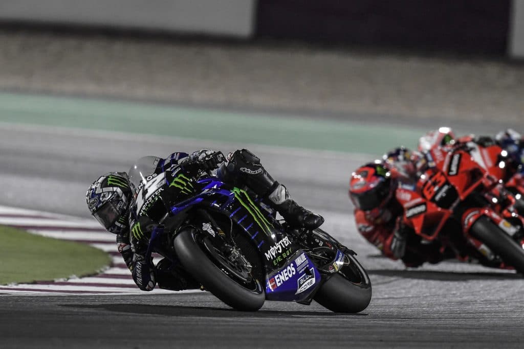 Maverick Vinales leads Francesco Bagnaia, Johann Zarco and Alex Rins in Qatar, 2021. Credit: Monster Energy Yamaha MotoGP Team/Monster Energy.