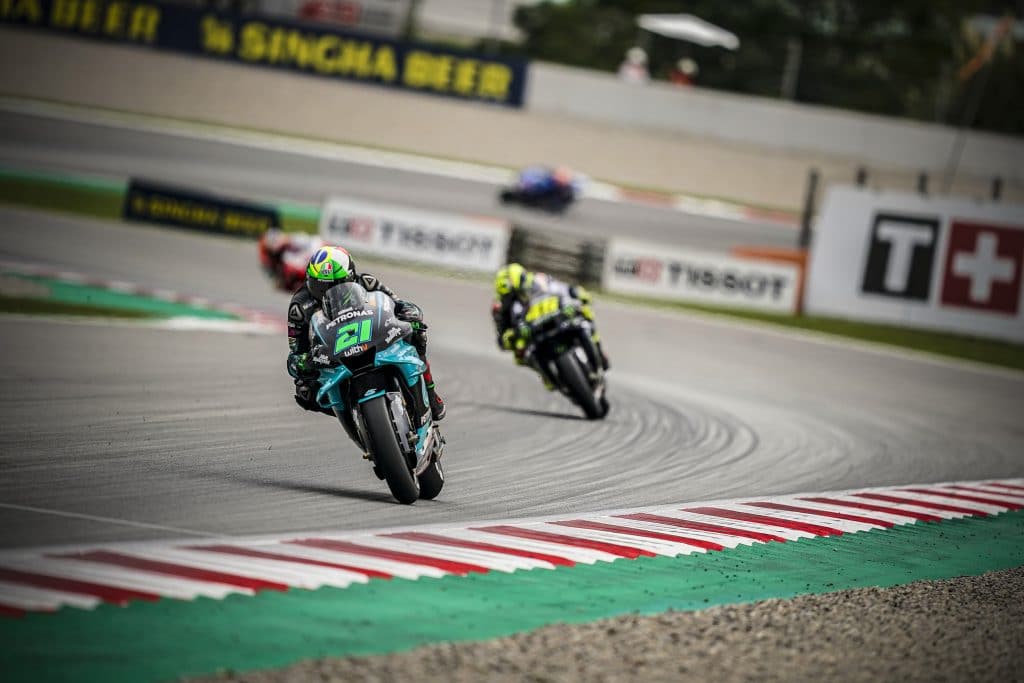 Franco Morbidelli leads Valentino Rossi and Jack Miller, Barcelona, 2020. Credit: Milagro/Monster Energy.
