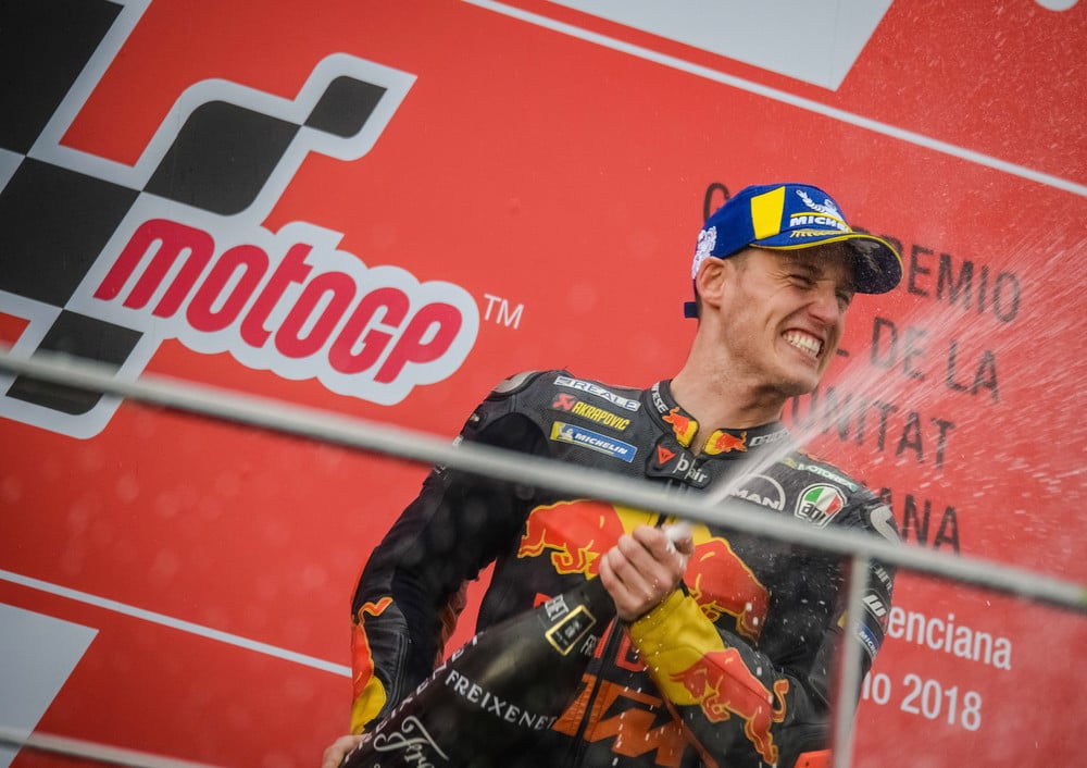 Pol Espargaro celebrates his and KTM’s first MotoGP podium in Valencia, 2018. Credit: Sebas Romero.