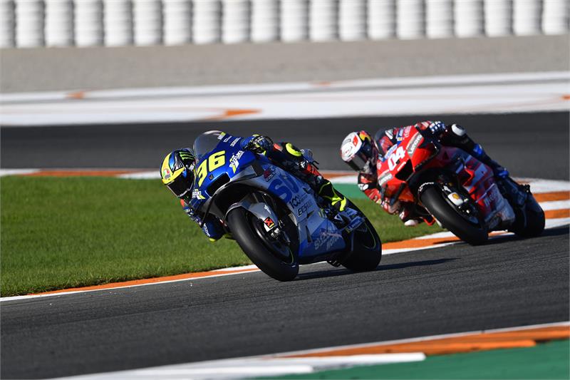 Joan Mir leads Andrea Dovizioso on his way to the 2020 MotoGP title in Valencia, 2020. Credit: www.suzuki-racing.com.