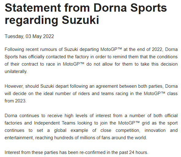 “Suzuki Motor Corporation is in discussions with Dorna regarding the possibility of ending its participation in MotoGP at the end of 2022.