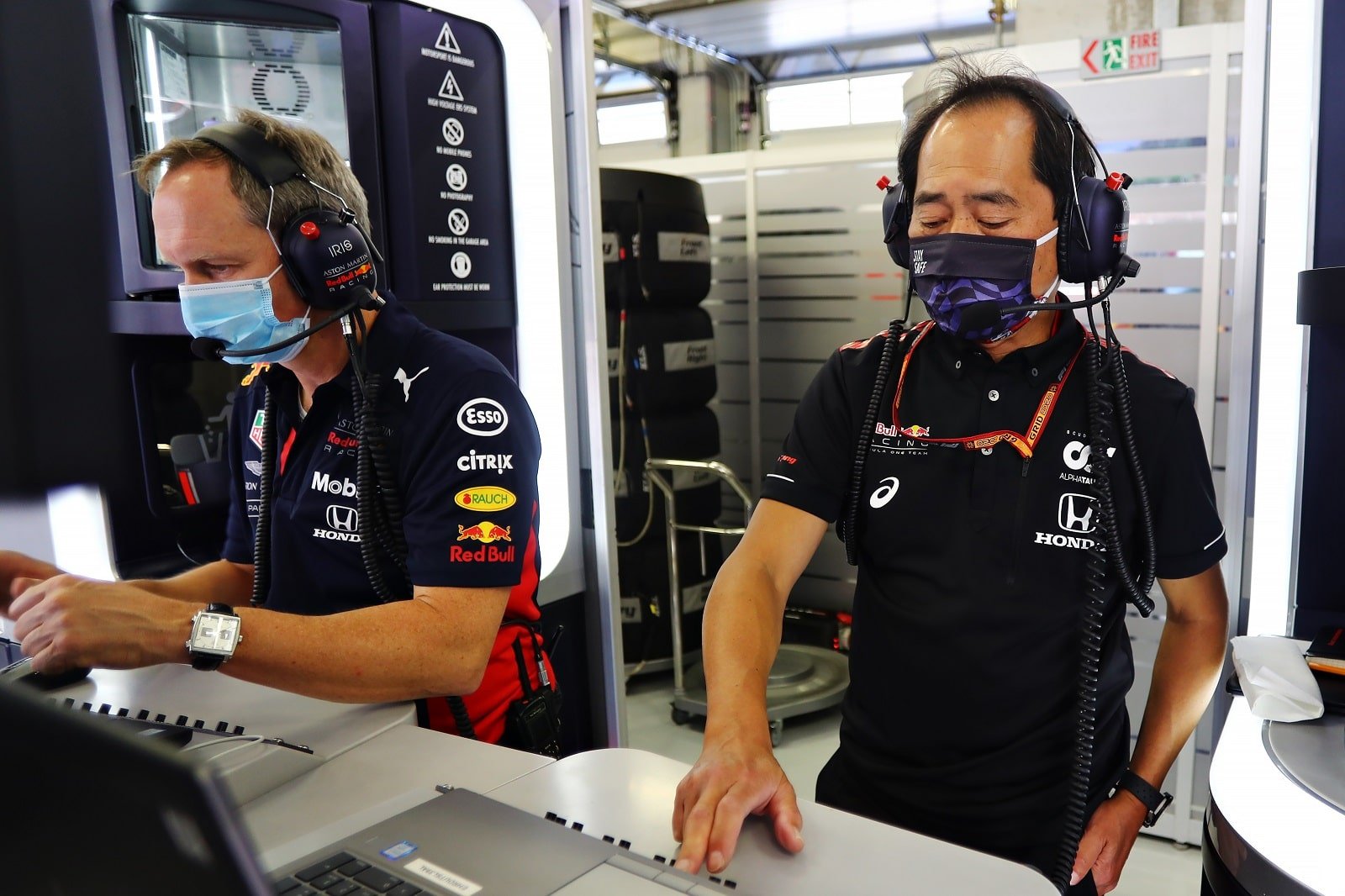 Masashi Yamamoto of Honda talks with a Honda engineer outside Red Bull Racing garage during qualifying for Austria at the Red Bull Ring (Credit: Getty Images/Getty Images)