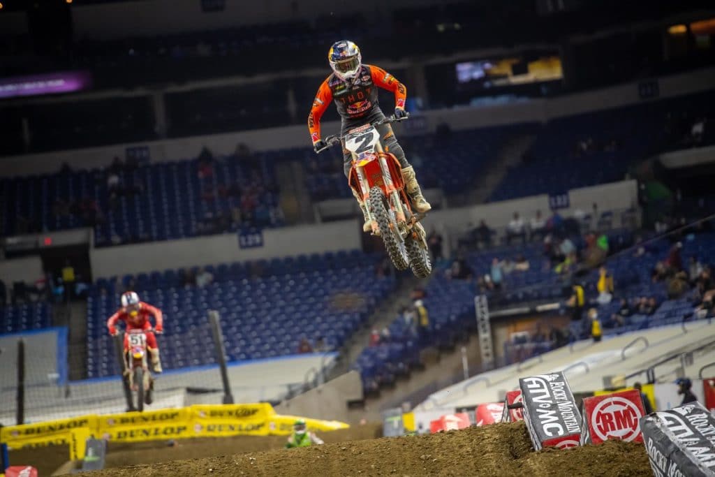 Cooper Webb and Justin Barcia tackle a rhythm lane in Indianapolis. Credit: Align Media.