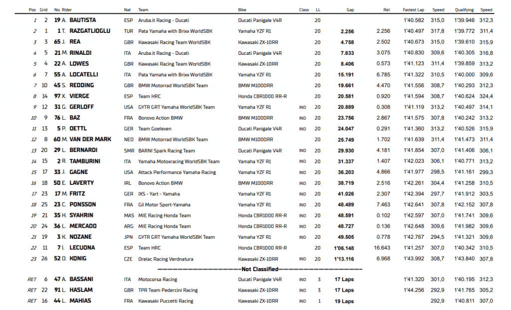 The Ducati rocket passed Razgatlioglu into turn one on lap nine of the race, putting Bautista into second place. Bautista appeared to be on a mission to take the lead off of Rea and check out.