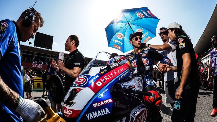 After Toprak Razgatlioglu won the Superpole race on Sunday morning he inherits pole position for the final race of the weekend. Alvaro Bautista and Jonathan Rea joined the Turkish rider on the front row of the grid.