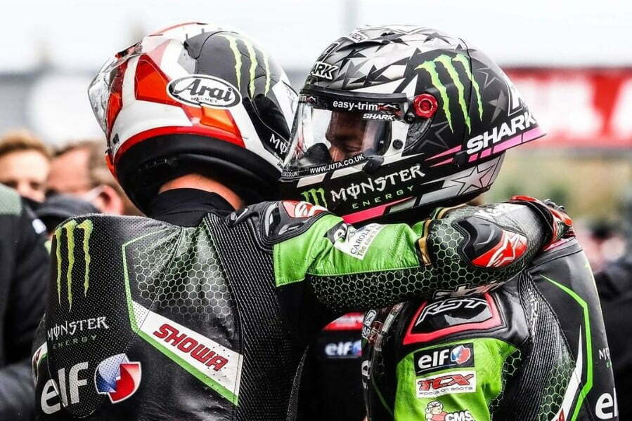 The Kawasaki teammates in parc fermé. Credit: WSBK